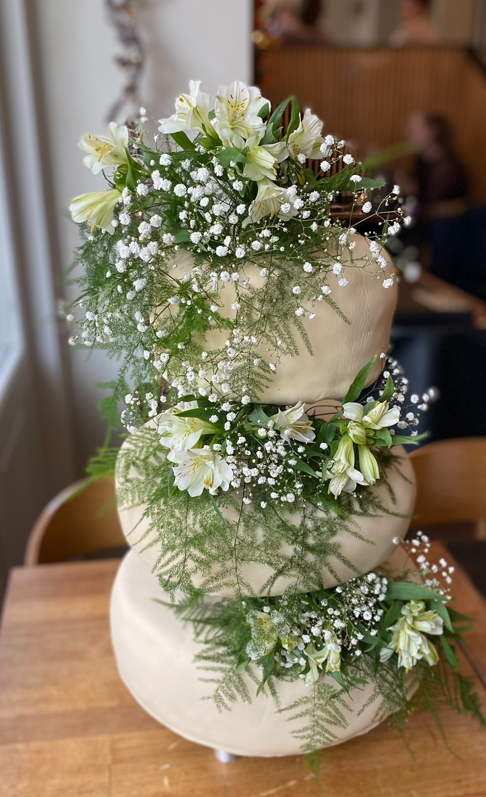 En smuk 3-5 etagers bryllupskage, der både smager fantastisk og imponerer visuelt.